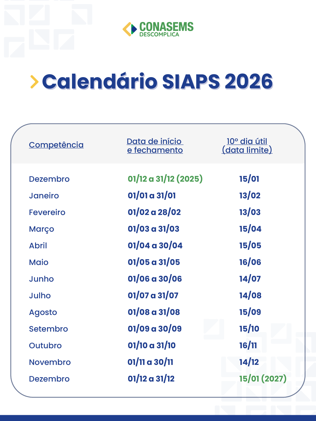 Com o objetivo de facilitar o acesso à informação pelos gestores municipais, o Conasems divulga o calendário com os prazos do SIAPS 2026, disponibilizado pelo Ministério da Saúde.