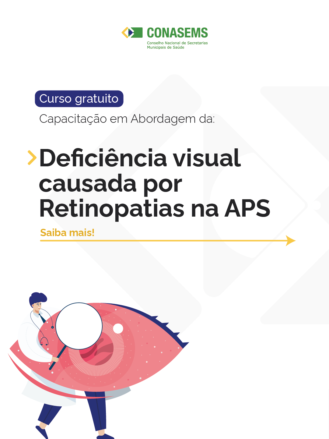 Também nesta semana, o Conasems divulgou o curso sobre o manejo adequado das retinopatias. O curso possui carga horária de 40 horas, e modalidade 100% virtual. Inscrevam-se por meio do Portal Mais Conasems.