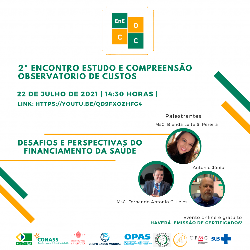 No próximo dia 22, o Núcleo Observatório de Custos e Economia da Saúde da Universidade Federal de Minas Gerais (NOCES/UFMG), irá realizar, às 14h30, o 2º Encontro Estudo e Compreensão Observatório de Custos (EnECOC): Desafios e Perspectivas do Financiamento da Saúde. O evento é online e será conduzido pelos palestrantes Antônio Júnior (CONASS), Blenda Leite Santurnino Pereira (CONASEMS) e Fernando Antonio Gomes Leles (OPAS/OMS).